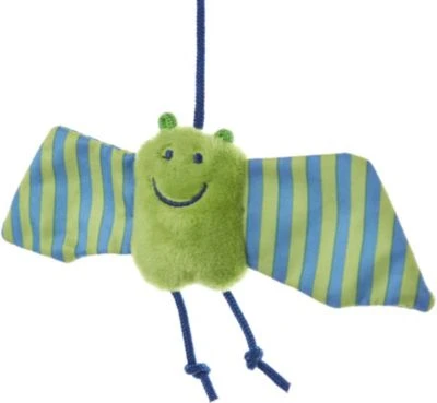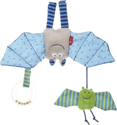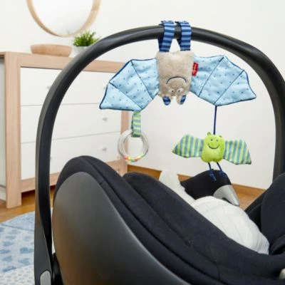 Dank des Klettverschlusses an den Beinen der Fledermaus, kann der Anhänger ganz einfach an einer Babyschale angebracht werden und schwupps hängt die Fledermaus kopfüber und bereitet dem Baby viel Spielspaß.